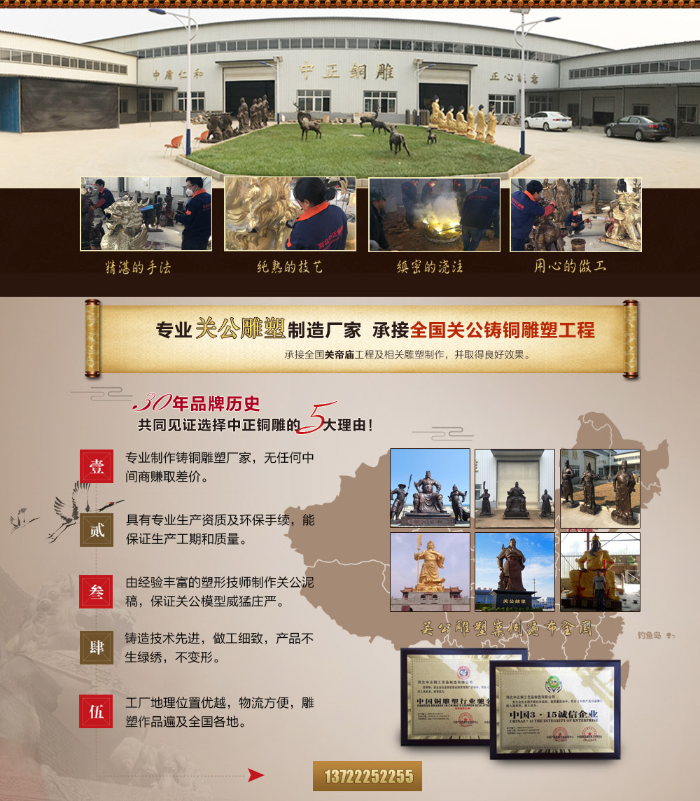 河北中正銅工藝品制造有限公司是一家具有獨(dú)立設(shè)計(jì)、雕塑、鑄造、制作施工能力的單位。擁有完善的,大型的,先進(jìn)的生產(chǎn)設(shè)備,并由多位經(jīng)驗(yàn)豐富的高級鑄造技師指導(dǎo)生產(chǎn)及制作。公司主要鑄造銅關(guān)公,九龍銅關(guān)公,福建銅關(guān)公,臺(tái)灣銅關(guān)公,關(guān)羽雕塑,鑄銅關(guān)公,銅雕關(guān)公,1米銅關(guān)公,2米銅關(guān)公等,可按客戶提供動(dòng)物銅雕圖片訂做加工銅關(guān)公,九龍銅關(guān)公,做工精美,質(zhì)量保證。